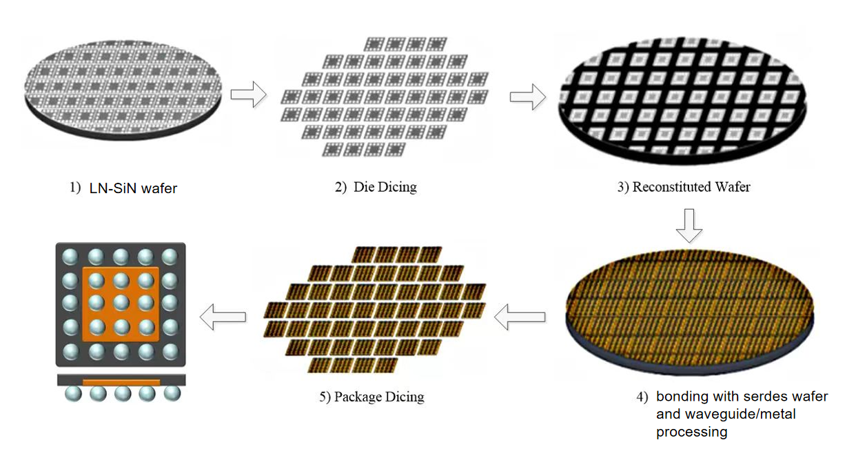 low loss high modulation efficient LN/SiN waveguide die2wafer and post via with serdes wafer